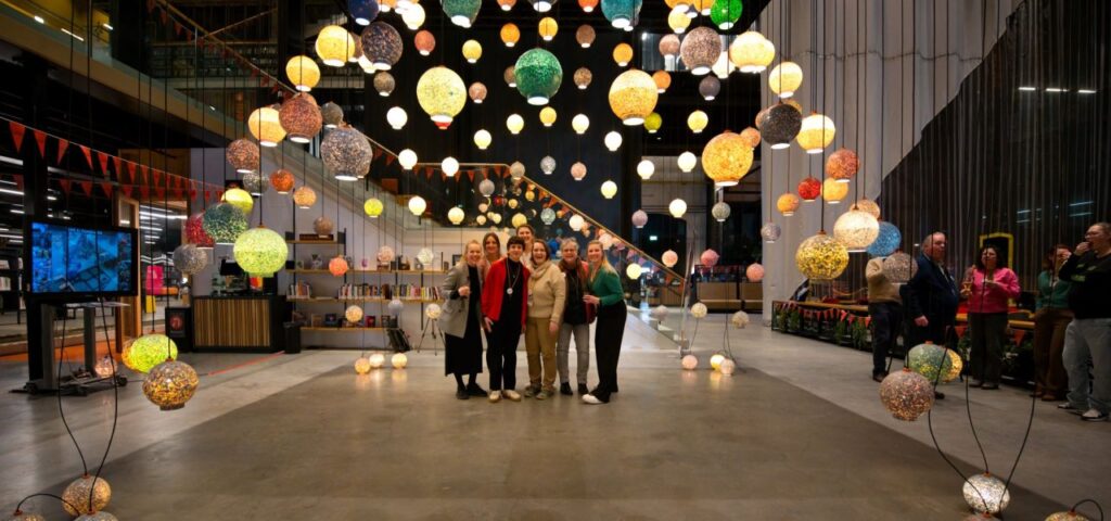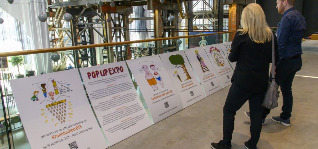 Hoewel corona dus ook tot nieuwe ontwikkelingen leidde, was het gebrek aan échte, fysieke interactie in die tijd ook een gemis. Na de eerste lockdowns was er gelukkig weer ruimte om ín de bibliotheek gesprekken en actie op gang te brengen. Zo werd in 2021 tijdens World Cleanup Day de KroonluchterØ13 onthuld, een gigantische kroonluchter helemaal gemaakt van gerecyclede, lokaal ingezamelde PET-flesjes. Zo’n fysiek object middenin de LocHal gaf heel veel zichtbaarheid aan het thema Plastic troep en de programmering daaromheen, die bestond uit verschillende inspiratiesessies, challenges, een expo en een workshop percussie op plastic afval.