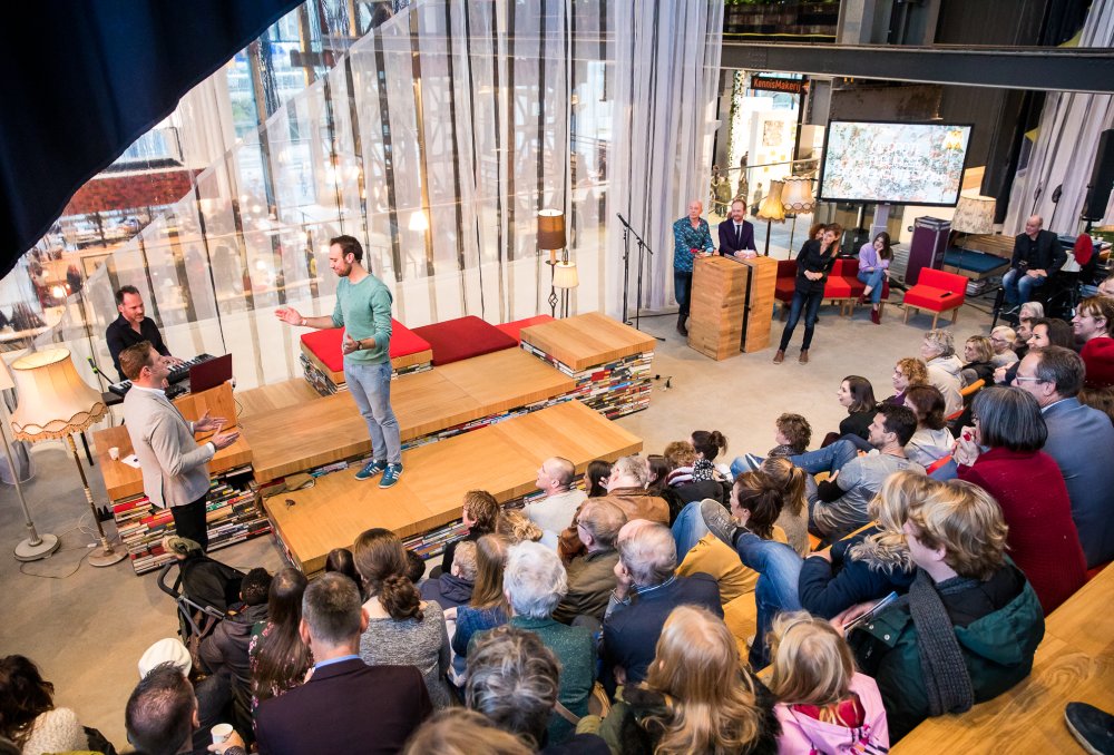 Het KennisMakerij-team kreeg een open opdracht mee: zoek nieuwe manieren waarop de Bibliotheek met haar podiumfunctie kennis en verhalen kan delen, anders dan alleen via het boek. Terugblikkend realiseert Eef hoe bijzonder die begintijd was: “We zaten in die Tilburgse Spoorzone perfect, op een plek waar veel gepionierd werd. Je riep iets, mensen haakten aan en dan ging je het gewoon samen doenOns motto werd: ‘Begint eer ge bezint.’ Zo hadden we toen we net twee maanden open waren, meteen een ‘volle bak’ bij het avondvullende programma Armoede leeft niet, dat we organiseerden samen met Eric Rugebregt van de Quiet 500. Kort daarna ging in Tilburg ook de eerste Quiet Community van start.”