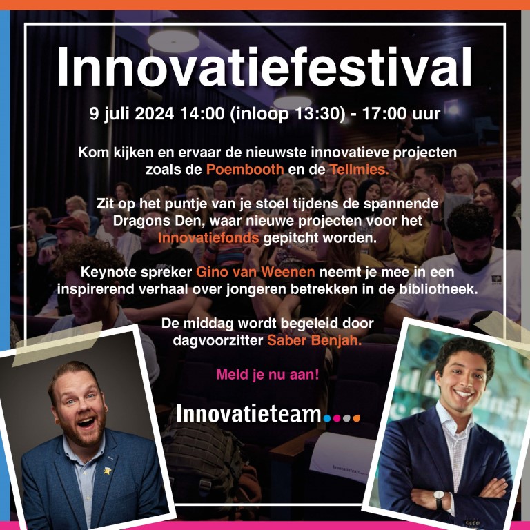 Op dinsdag 9 juli vindt voor de derde keer het Innovatiefestival plaats, dit keer in de Meerpaal, Dronten. Een middag waar De Nieuwe Bibliotheek en FlevoMeer Bibliotheek samen met hun partners op zoek gaan naar kansrijke innovaties. Dat kan bijvoorbeeld een activiteit zijn waarbij de locatie van de bibliotheek wordt ingezet of een project waarbij kennis en expertise van de bibliotheek wordt benut.