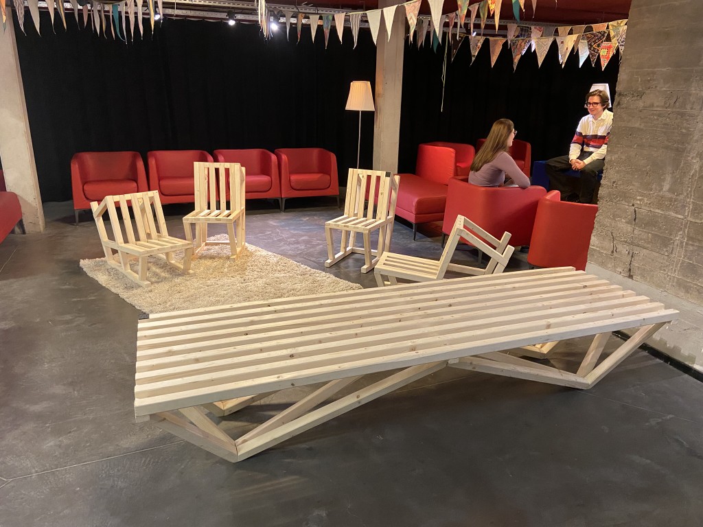 De foyer werd het werkterrein voor Shahad Hamid en haar collega-studenten. Zij doopten hun zitmeubel ‘Ultralight’. “We maakten een zo licht mogelijk ontwerp waarvoor we weinig materiaal moesten gebruiken”, zegt Shahad. “Bezoekers die een boek willen lezen, kunnen dat comfortabel doen op onze bank. We kozen ervoor met verschillende hoogtes te werken, zodat kinderen en volwassenen er gebruik van kunnen maken. De voorbije weken maakten we vele kleine maquettes, we deden veel testwerk, maar het blijft toch spannend om het meubel echt gebruikt te zien worden.”