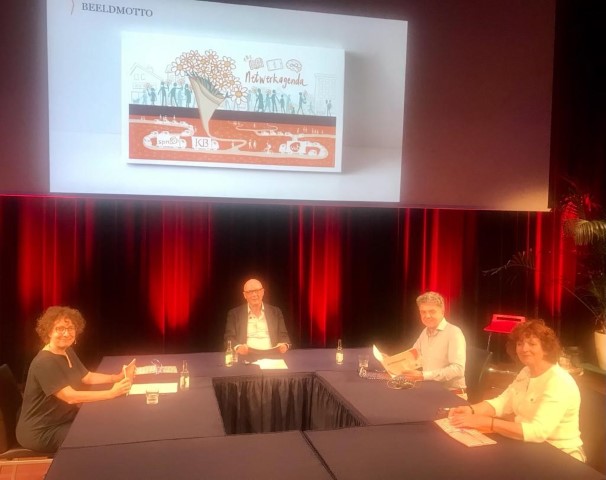 Algemeen directeur van de KB, Lily Knibbeler, samen met KB-afdelingshoofd Bibliotheekstelsel Jos Debeij, interim-directeur van de VOB Anton Kok, en SPN-voorzitter Tineke van Ham tijdens de presentatie van de Netwerkagenda op 16 juni in de OBA.