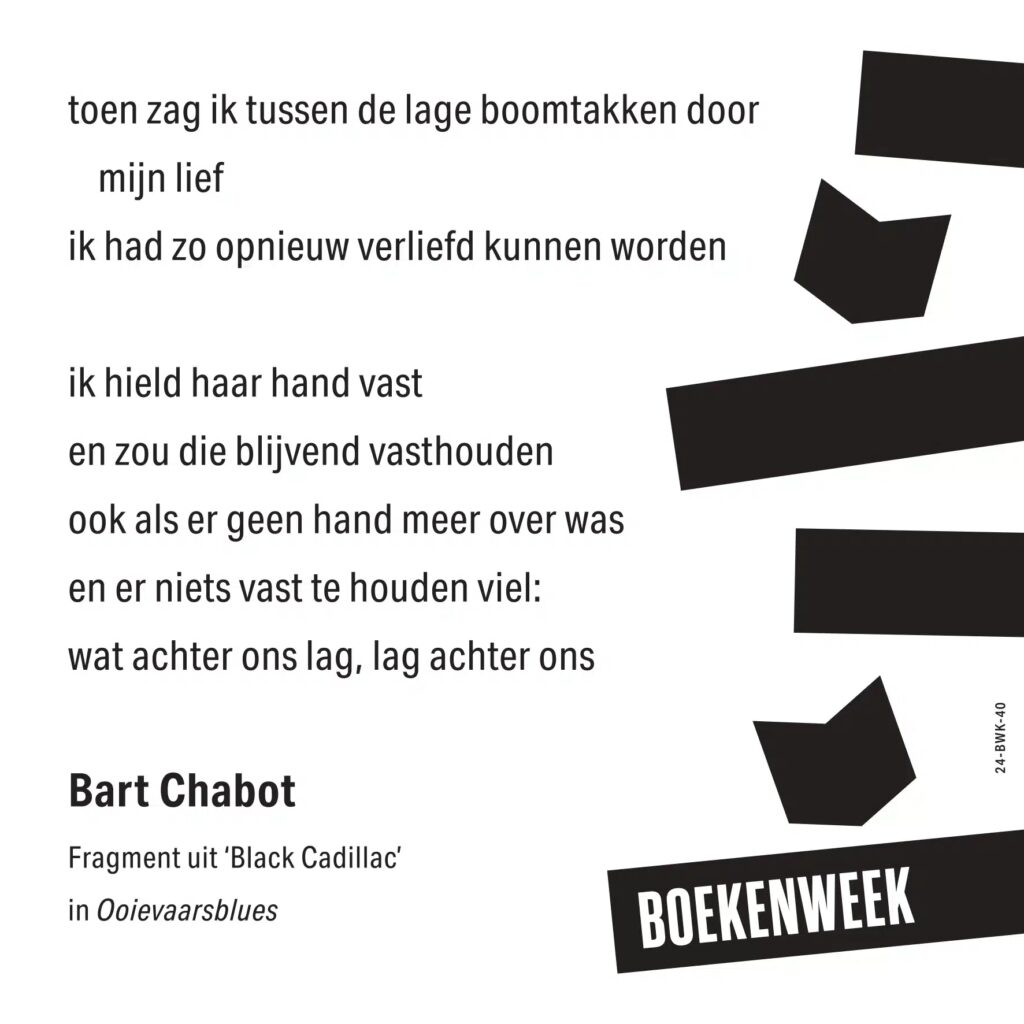 Het Boekenweekgedicht 2024 is geschreven door Bart Chabot, pater familias van de Chabotten die dit jaar hét gezicht vormen van de Boekenweek. ‘Black Cadillac’, het laatste gedicht van de speciale bundel Ooievaarsblues, werd onthuld in dagblad Trouw, begeleid door een uitgebreid interview met de dichter. De jaarlijkse thema-uitgave is dit jaar een poëziebundel, die tijdens de Boekenweek voor € 5 verkrijgbaar is in de boekhandel.