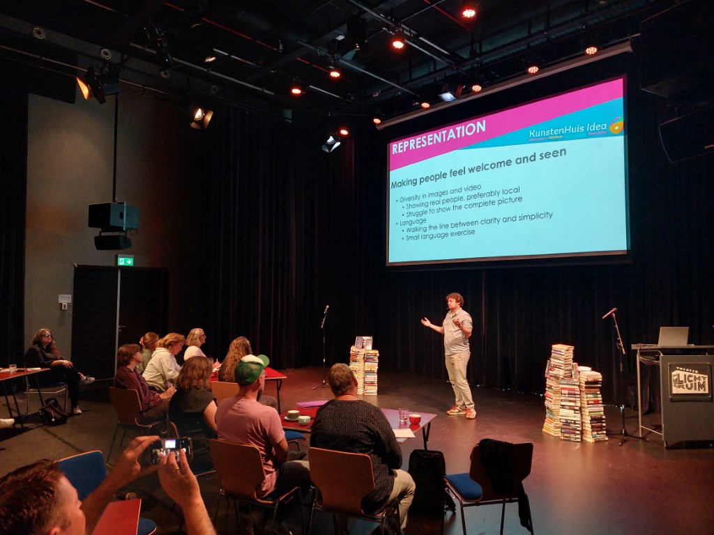 Marieke Wiersma, manager van de bibliotheektak van KunstenHuis Idea, illustreerde met een aantal projecten hoe diversiteit en inclusie een plek krijgen bij de Bibliotheek. Zij deed dit aan de hand van drie doelgroepen (nieuwkomers, kinderen & jongeren en ouderen). Per onderwerp werd er steeds gekeken naar de projecten, de samenwerkingen, de kansen, maar ook de uitdagingen. KunstenHuis Idea werkt in al deze gevallen met een projectmatige aanpak waar creativiteit in dienst staat van de maatschappelijke uitdaging.