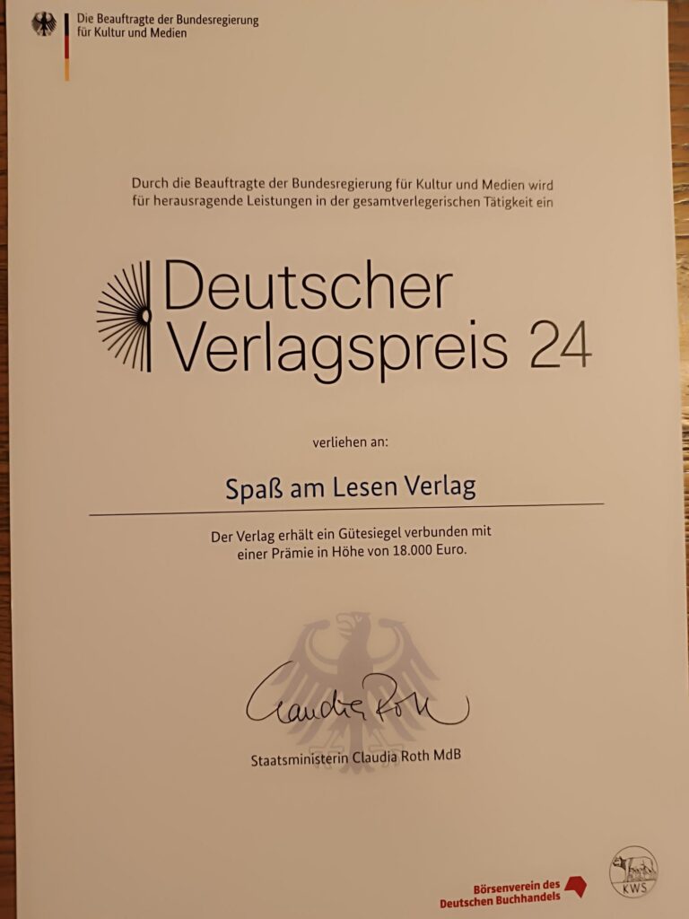 De Deutscher Verlagspreis is de belangrijkste prijs voor uitgeverijen in Duitsland. Spaß am Lesen Verlag, de zusteruitgeverij van Eenvoudig Communiceren, ontving deze prijs van Claudia Roth, minister van Cultuur en Media in Duitsland, tijdens de Frankfurter Buchmesse. Minister Roth benadrukte het belang van kleine, onafhankelijke uitgeverijen als Spaß am Lesen Verlag voor de democratie. Dankzij deze uitgeverijen kunnen alle doelgroepen bereikt en geïnformeerd worden. Minister Roth is dan ook van plan om een voorstel in te dienen voor subsidieregelingen voor kleine uitgeverijen.