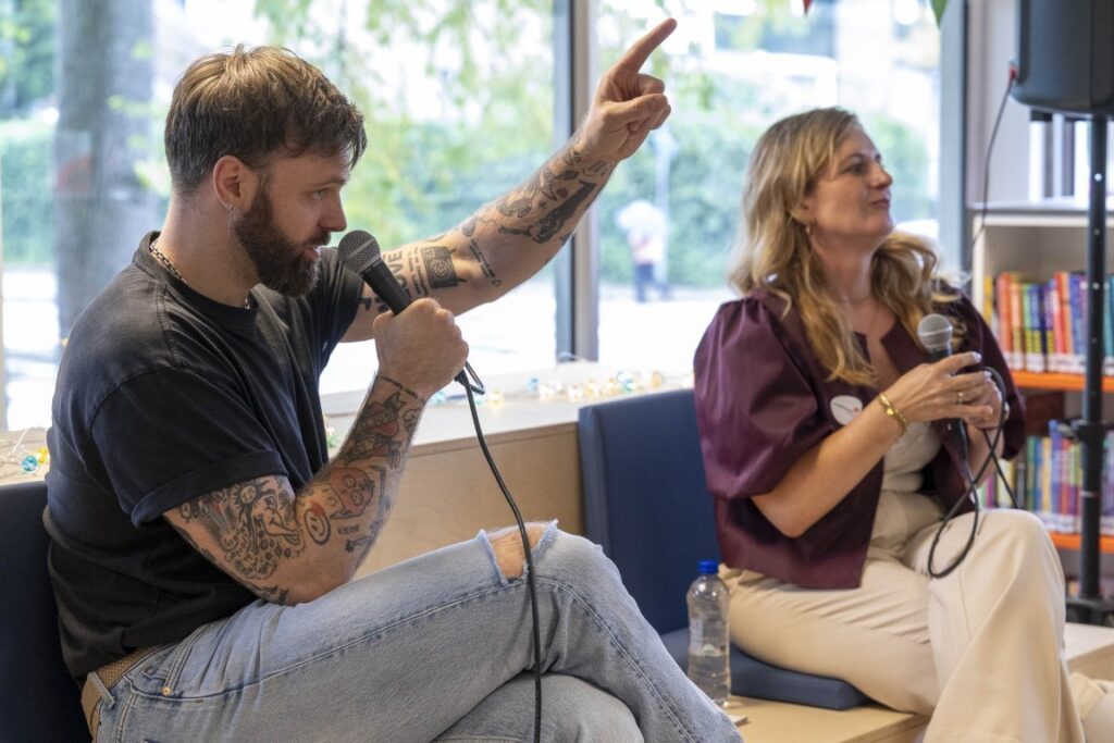 In het pand dat gedeeld wordt met garage Nooteboom werd de opening van de nieuwe ontmoetingsplek voor Schiedam Noord gevierd met een live-interview met journalist Tim Hofman, voor hem een echte ‘thuiswedstrijd’.