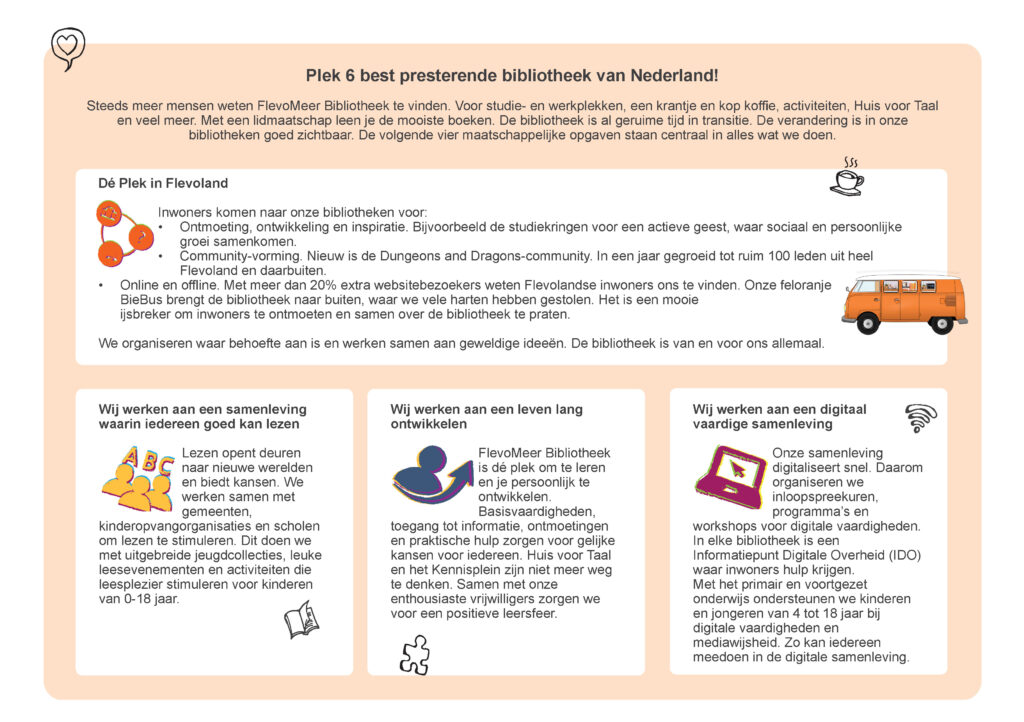 FlevoMeer Bibliotheek heeft de resultaten over 2023 in een factsheet gepresenteerd. Alle projecten en activiteiten stonden in het teken van maatschappelijke opgaven zoals De geletterde samenleving, Participatie in de informatiesamenleving, Een leven lang ontwikkelen en Dé Plek. FlevoMeer Bibliotheek omvat zeven bibliotheken in Flevoland.