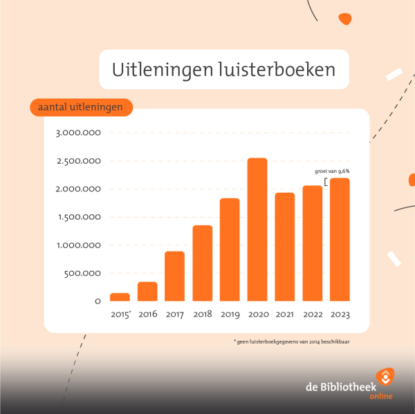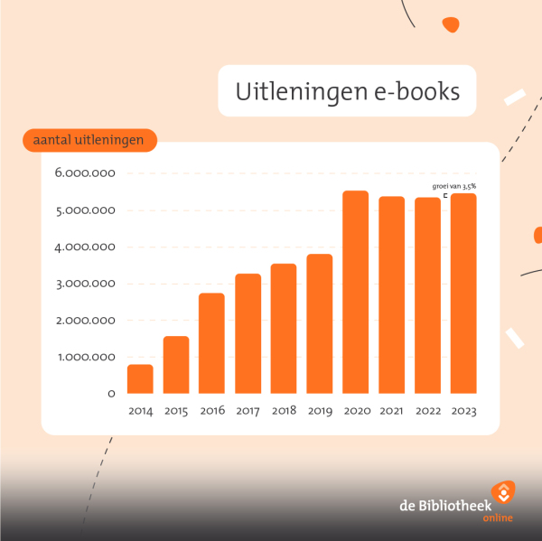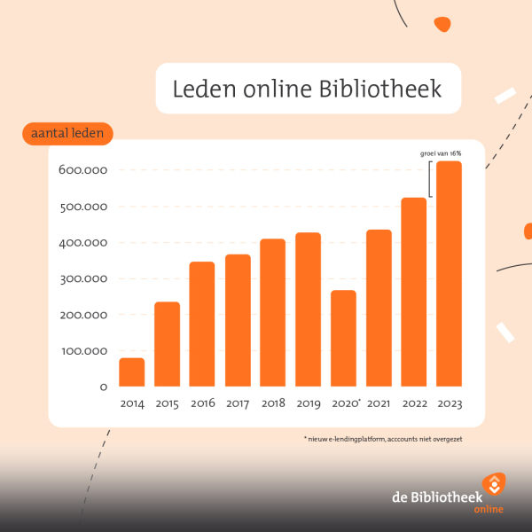 Het aantal mensen dat lid wordt van de online Bibliotheek blijft stijgen. Waar de online Bibliotheek in 2022 ruim 524 duizend leden telde, waren dat er in 2023 ruim 608 duizend. Een stijging van 16%. Zowel het aantal leden als het aantal uitleningen groeit. In totaal werden er in 2023 bijna 5,5 miljoen e-books en een kleine 2,3 miljoen luisterboeken geleend. In 2022 waren dat respectievelijk 5,3 en 2,1 miljoen.