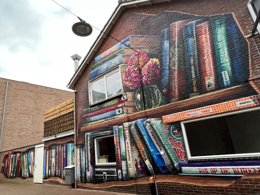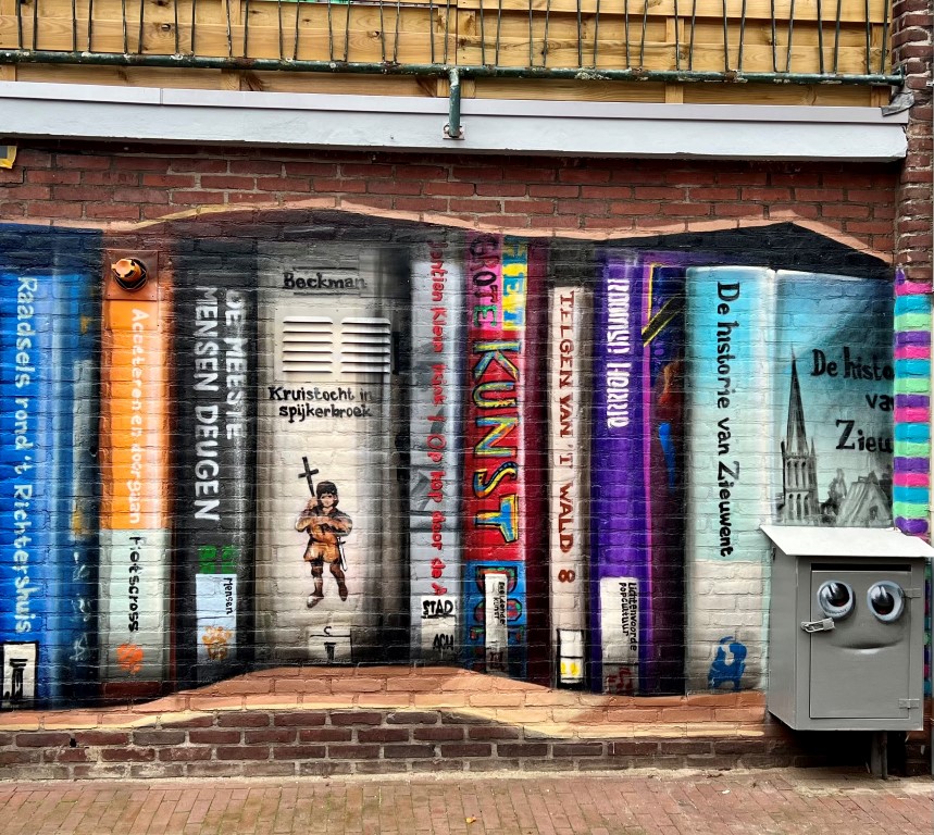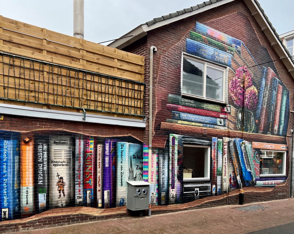 Drie jaar geleden kregen de plannen voor de nieuwe bibliotheek in het centrum van Lichtenvoorde definitieve vormen. Om ook buiten de bibliotheek een blikvanger te realiseren zocht de Bibliotheek Oost-Achterhoek contact met Natasja Scharenborg van ‘Streetart Oost Gelre’. “Met onder mijn arm afbeeldingen van een fantastische muur, die in dat voorjaar in Utrecht was verschenen, meldden we ons bij Natasja Scharenborg, die als projectleider verbonden is aan het programma ‘Geef Lichtenvoorde Kleur’. Lichtenvoorde staat bekend om kleurrijke evenementen als de Zwarte Cross en het bloemencorso. De gemeente wil dat ook tot uiting laten komen in het straatbeeld van het Achterhoekse dorp. Dat gebeurt in de vorm van streetartkunstwerken. Utrechtenaar JanIsDeMan had net zijn eerste gigantische boekenkast gerealiseerd, waar lovend over gesproken werd en wordt”, aldus Resy Oonk, PR/Communicatiemedewerker van de Bibliotheek Oost-Achterhoek. “Natasja was direct enthousiast en ging aan de slag met het leggen van de nodige contacten. Ook de gemeente Oost Gelre was direct enthousiast over de plannen en zorgde voor de financiering. Daarna volgden gesprekken met pandeigenaren. Ondertussen werd de nieuwe bieb gebouwd. De toen volgende coronaperiode zorgde voor vertraging, maar in het begin van 2022 werd duidelijk dat het muurproject gerealiseerd kon worden”, aldus Resy.