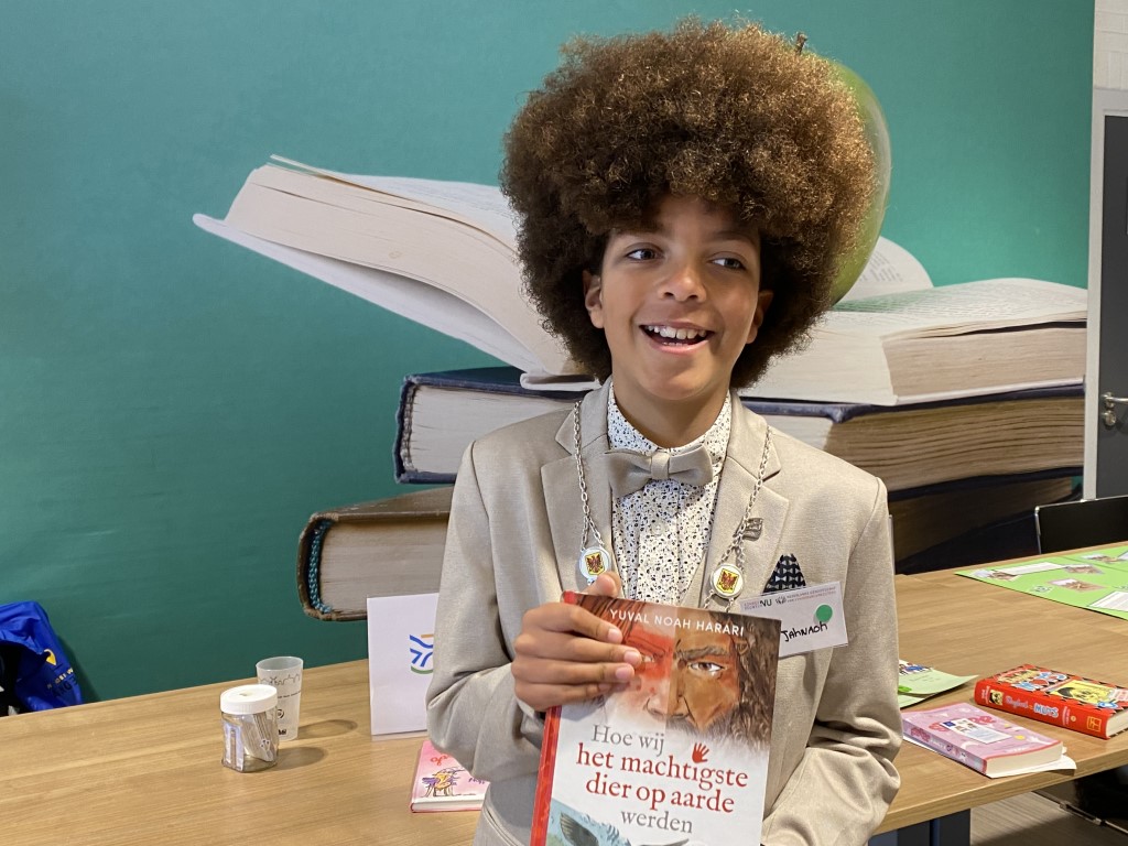Buitenspeelplannen, favoriete leesboeken en de ambtsketens werden bij binnenkomst afgegeven en tentoongesteld aan andere kinderburgemeesters, vaders, moeders en gemeentelijke medewerkers die aanwezig waren. Tussen deze bedrijvigheid door kon ik, namens Bibliotheek Noordwest Veluwe, het natuurlijk niet laten van de gelegenheid gebruik te maken om een aantal kinderen te spreken over hun meegenomen, favoriete, leesboek.
