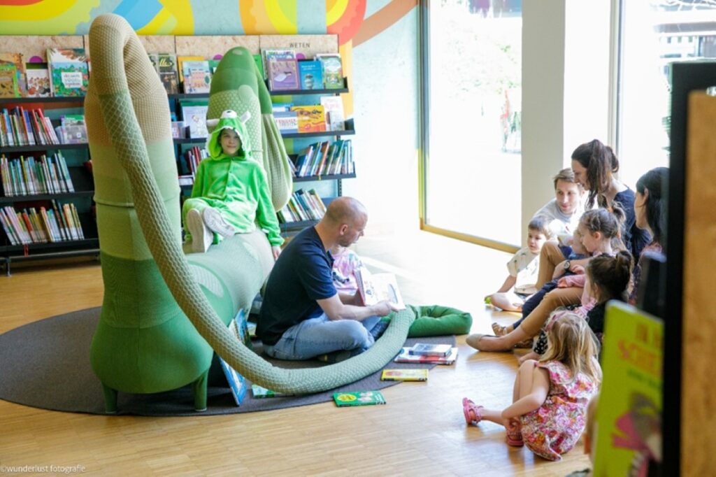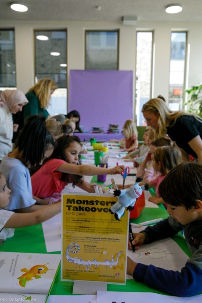 Bij de opening waren veel kinderen aanwezig, sommigen kwamen zelfs in monsterpak! Samen met een groepje durfals onthulde Pieke Bergmans de levensgrote ‘Monsters…’ stukje bij beetje door de touwen en doeken ervan af te halen. De kinderen klommen er meteen enthousiast op om te zitten en spelen. En om te luisteren naar het voorlezen uit monsterboeken. Pieke gaf een workshop ‘Maak je je eigen monster… boekenverslinder’.