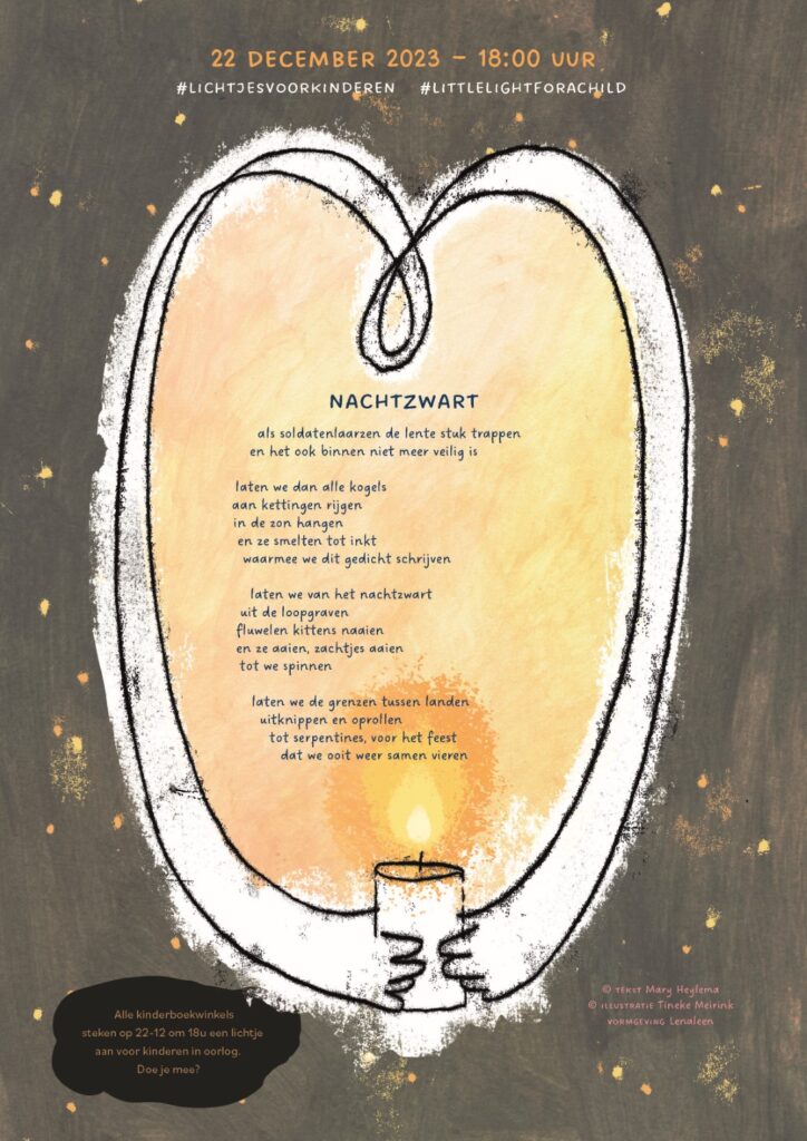 Om de actie kracht bij te zetten en invoelbaar te maken, hebben dichter Mary Heylema en illustrator Tineke Meirink een poëzieposter gemaakt die in alle kinderboekhandels zal komen te hangen. Online wordt dit beeld gedeeld met de hashtags #lichtjesvoorkinderen en #littlelightforachild.