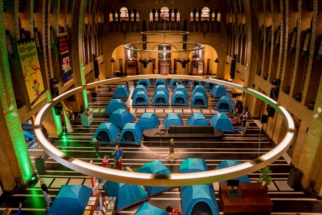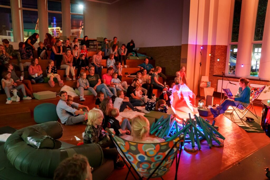 Op vrijdagavond 7 oktober werden er 42 tentjes opgezet in de Grote hal van Bibliotheek Neude. Meer dan 50 kinderen bleven er een nachtje slapen met een ouder of verzorger. Met recht een uniek event: dit is de allereerste keer dat er iemand mag blijven slapen in de bieb. En dan meteen ook ruim 50 kinderen, zo’n 100 personen totaal. In de Grote hal van Bibliotheek Neude werden 42 bieb-tenten opgezet. Na de Kindernacht van de Poëzie, in samenwerking met het ILFU, met fantastische dichters en schrijvers zoals Bibi Dumon Tak, Elten Kiene, Bette Westera en Ted van Lieshout op het podium gingen de bezoekers nog lang niet naar bed. Kinderen gingen hun eigen tentje versieren, maakten een glow in the dark kussensloop en gingen op pad met de nachtwakers. Er waren Meet & greets met schrijvers, een Gi-ga-groene speurtocht en gingen dansen tussen de boeken. En uiteraard nog een mooi verhaal voor het slapengaan.