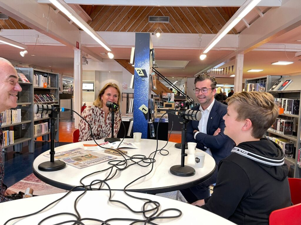 Sylvia Bakker (voorzitter Raad van Toezicht praat met Wil en Anne-Roos over het OntdekLAB, mini-robotjes die je kunstjes kunt laten doen, techniek, de bibliotheek (ook op school), James Bond en nog veel meer. Ook wethouder Vincent Tuijp kwam met zijn zoon langs.