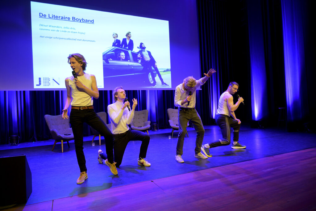 •De Literaire Boyband zorgde voor een muzikaal intermezzo. Zij maken literatuur om doorheen te gillen: poëzie op een podium, maar dan met meezingbare refreinen, zwoele blikken en de constante dreiging van een break-up.