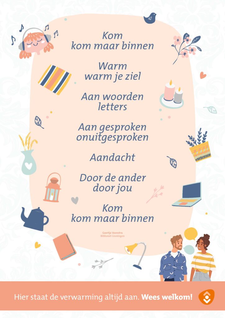 Sinds kort wijst een postergedicht (zie onder) bij de voordeur van de bibliotheken van Biblionet Groningen voorbijgangers er nog eens extra op dat iedereen welkom is in de bibliotheek. Met deze mini-actie, waarin Biblionet Groningen de verblijfs- en ontmoetingsfunctie van de bibliotheek benadrukt, sluit de organisatie aan bij de Warme Kamers campagne van het Leger des Heils.