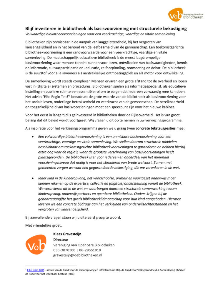 De VOB heeft bij alle verkiezingsprogrammacommissies van politieke partijen het belang van volwaardige bibliotheekvoorzieningen voor een veerkrachtige, vaardige en vitale samenleving onder de aandacht gebracht. ‘Blijf investeren in bibliotheek als basisvoorziening met structurele bekostiging’ De brief is hieronder te lezen.